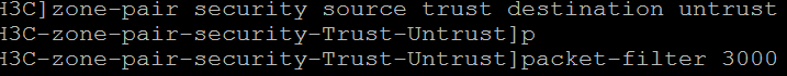 上面配置zone-pair security source trust destination untrust packet-filter 3000 是 不是安全策略放行命令,请教,谢谢 security-policy ip rule name Trust-Untrust source-zone trust destination-zone untrust service ping action pass这命令H3C模拟器出错,不明白,请教