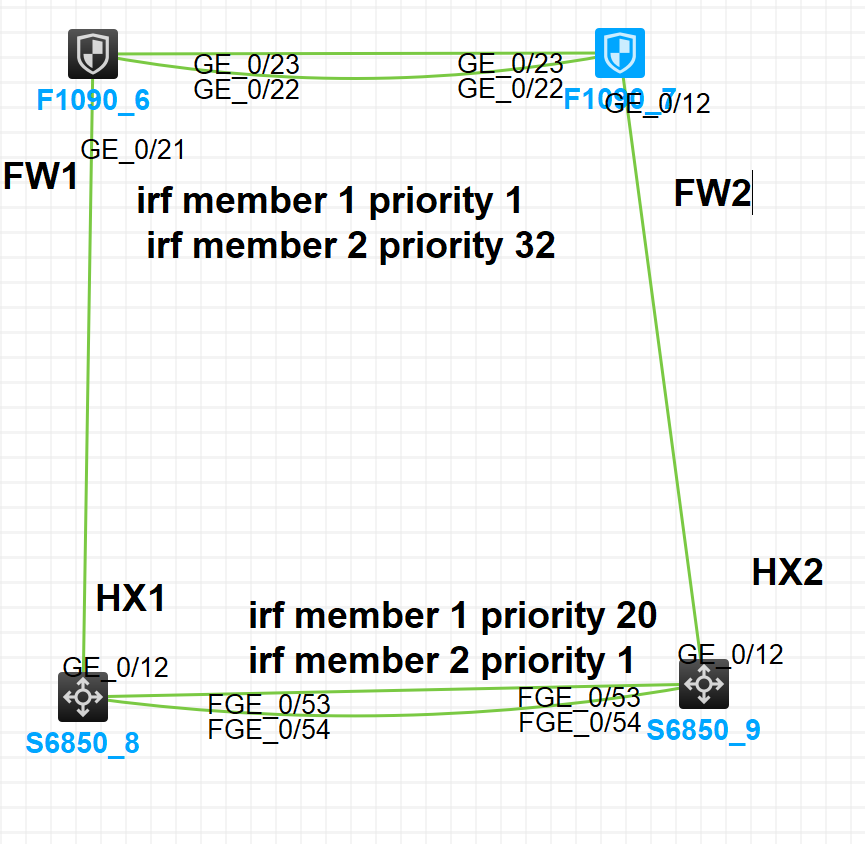 防火墙和交换机都是做的堆叠,防火墙和交换机分别是fw1一条线连接hx1,fw2一条线连接hx2。