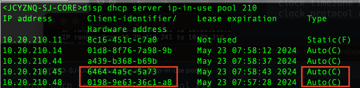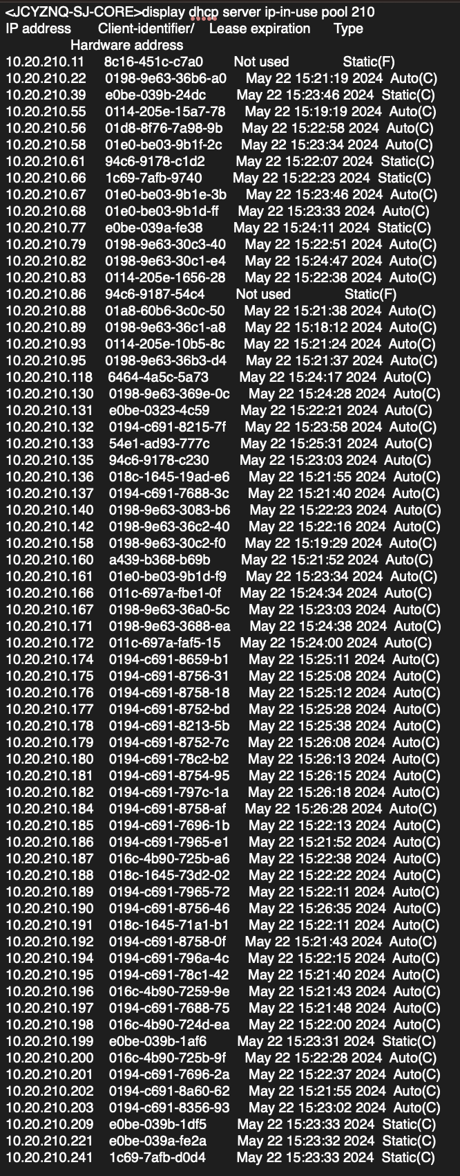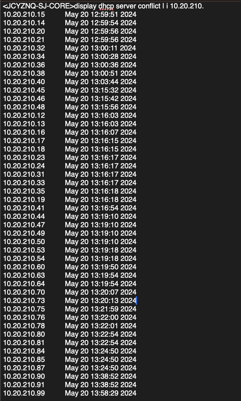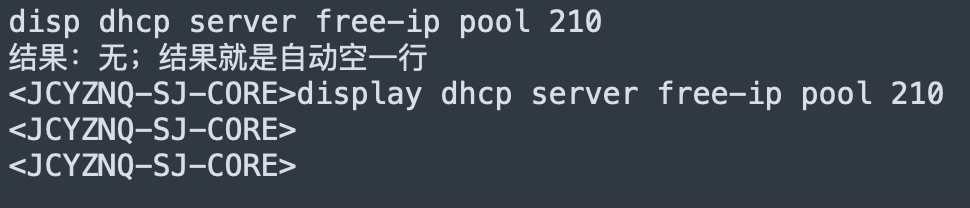通过我给的配置可以看到,除开“已用IP、冲突IP”,10.20.210.xxx/24 网段是还有可以IP的,但是在核心交换机 disp dhcp server free-ip pool 210 的结果就是没有,直接空一行。