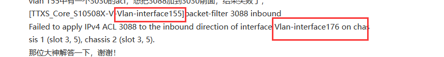 Failed to apply IPv4 ACL 3088 to the inbound direction of interface Vlan-interface176 on chassis 1 (slot 3, 5), chassis 2 (slot 3, 5).