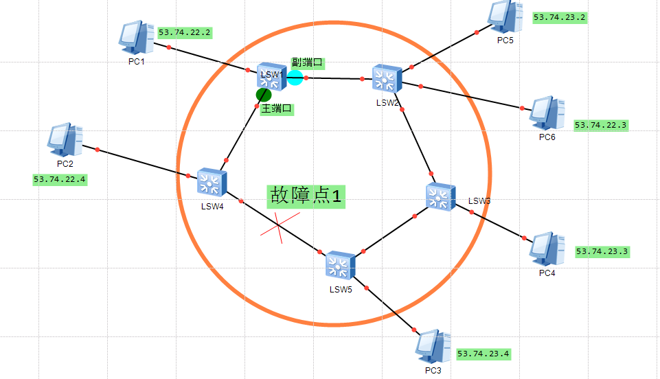 如图,组建华三rrpp环网,正常情况下sw1的副端口为blocked状态,假设网关在sw1上面,业务流量路径为是sw2-sw3-sw5-sw4-sw1回来,当sw4与sw5之间发生故障点以后,sw1的副端口会变为forwarding状态,业务流量会从sw5-sw3-sw2-sw1和另一条路径sw4-sw1回来,当出现一个故障点后,不影响业务的正常转发,