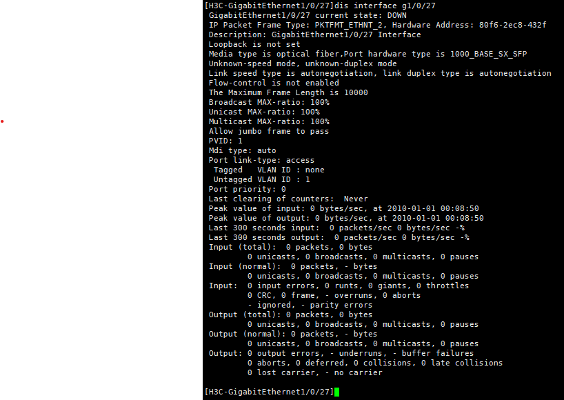 设备是台旧设备,为了避免原配置干扰,刚刚reset了所有配置,交换机重启后,电口接线指示灯正常显示,光口接线灯不亮。对端设备上的光模块指示灯显示正常。具体端口配置信息如下图: