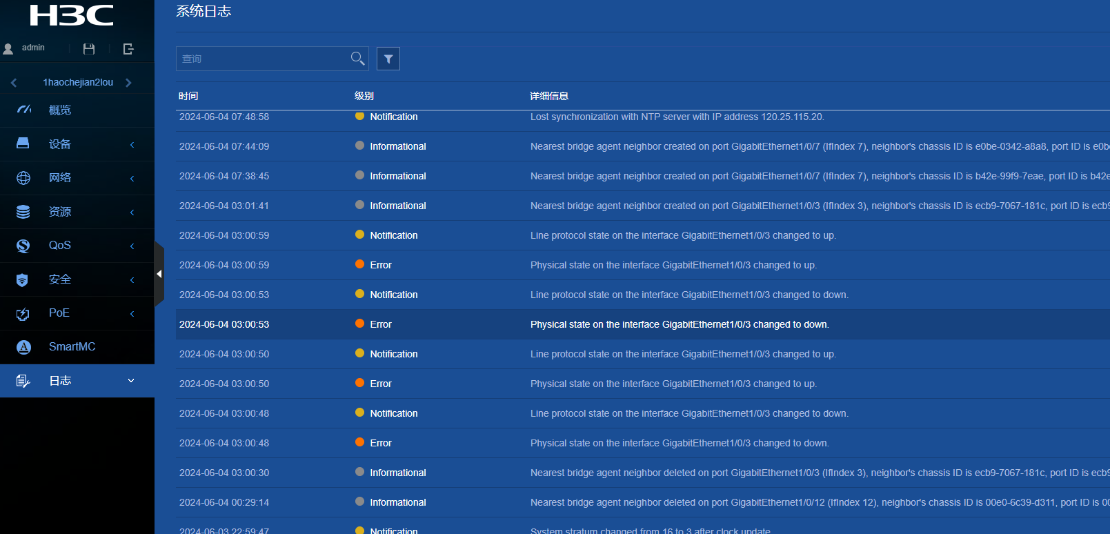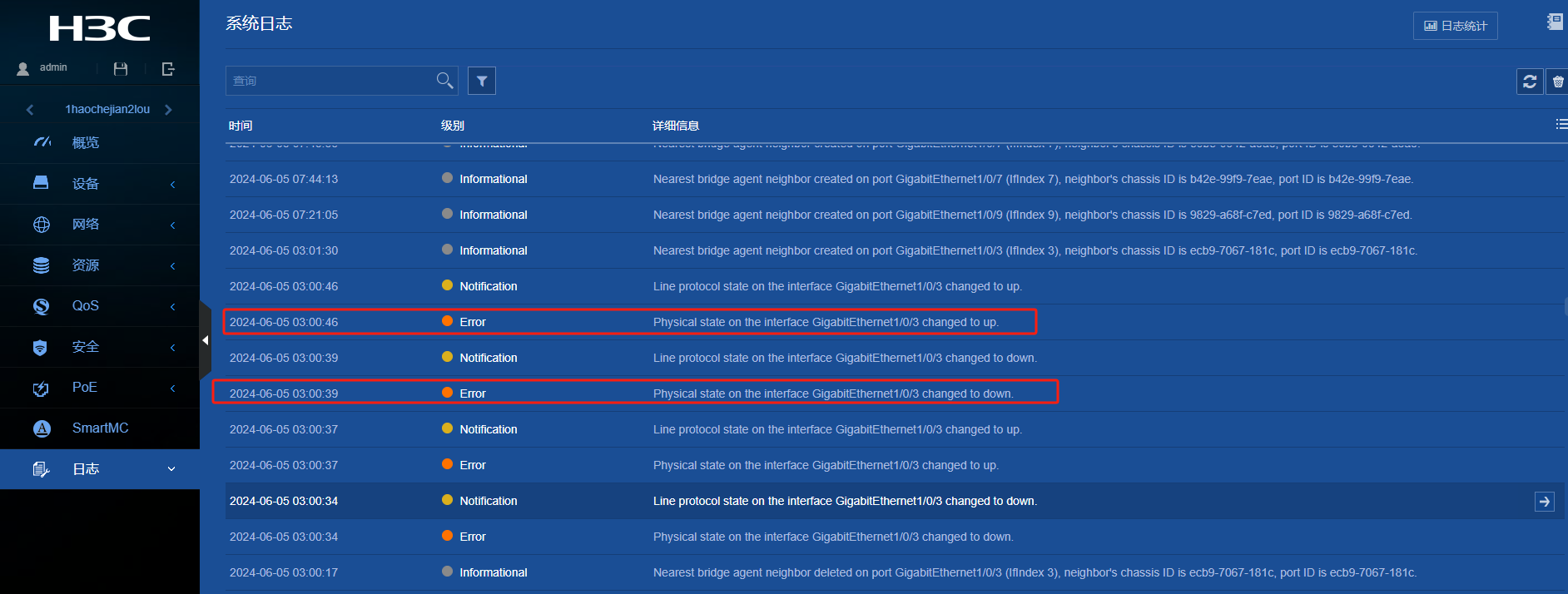 近期查看交换机日志发现某一个端口每天都会自动关闭及开启,这个端口3口下面是网线直连的一个ap设备