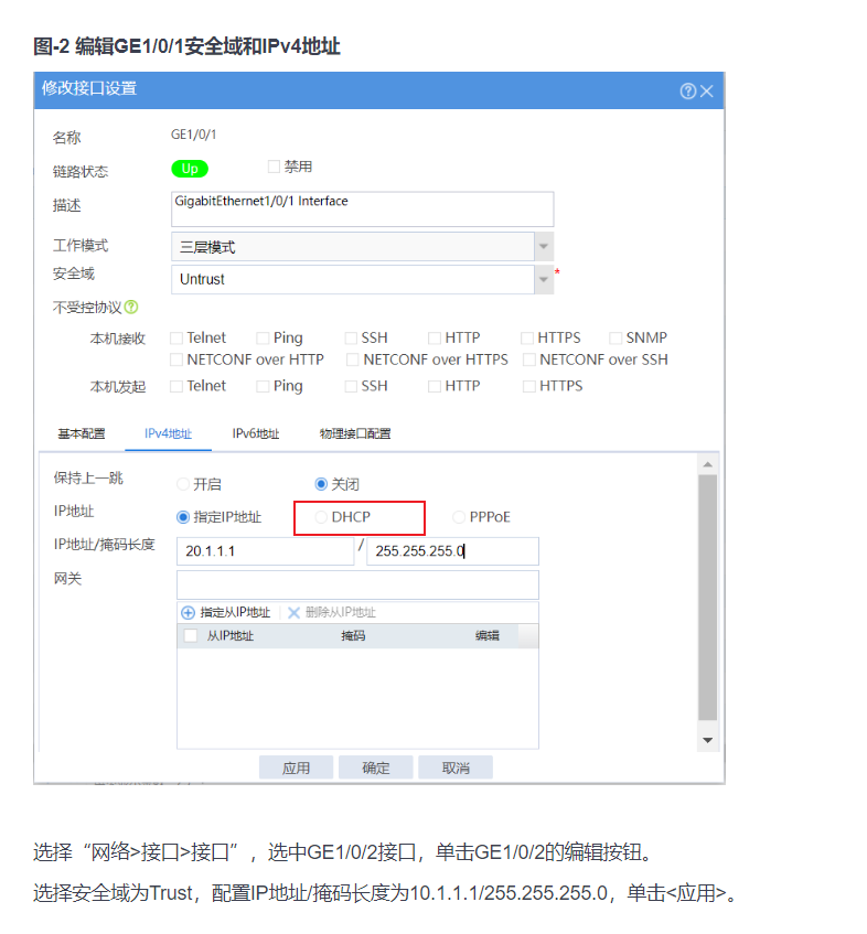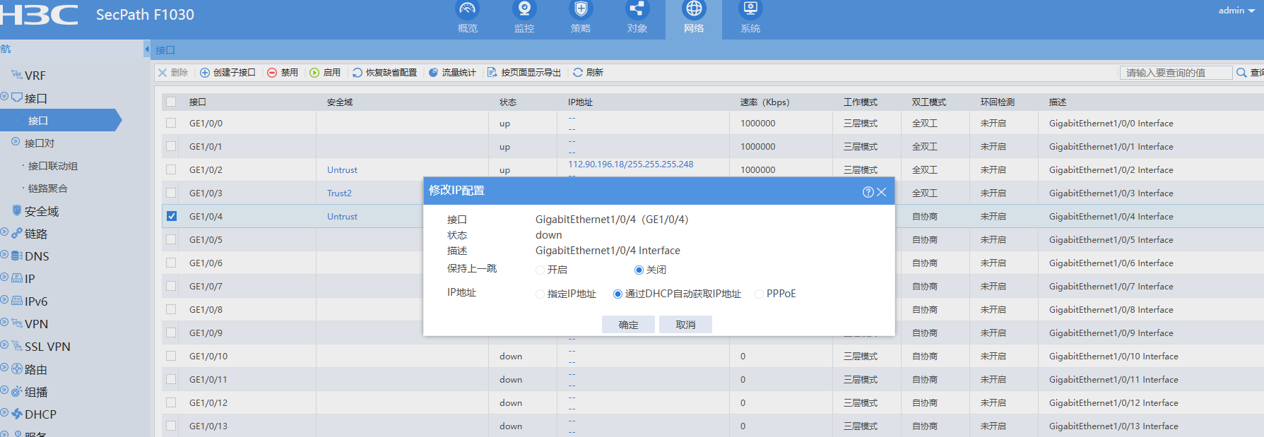 进web界面进接口上网方式选择dhcp 在命令行的话 就进接口输入 ip address dhcp-alloc