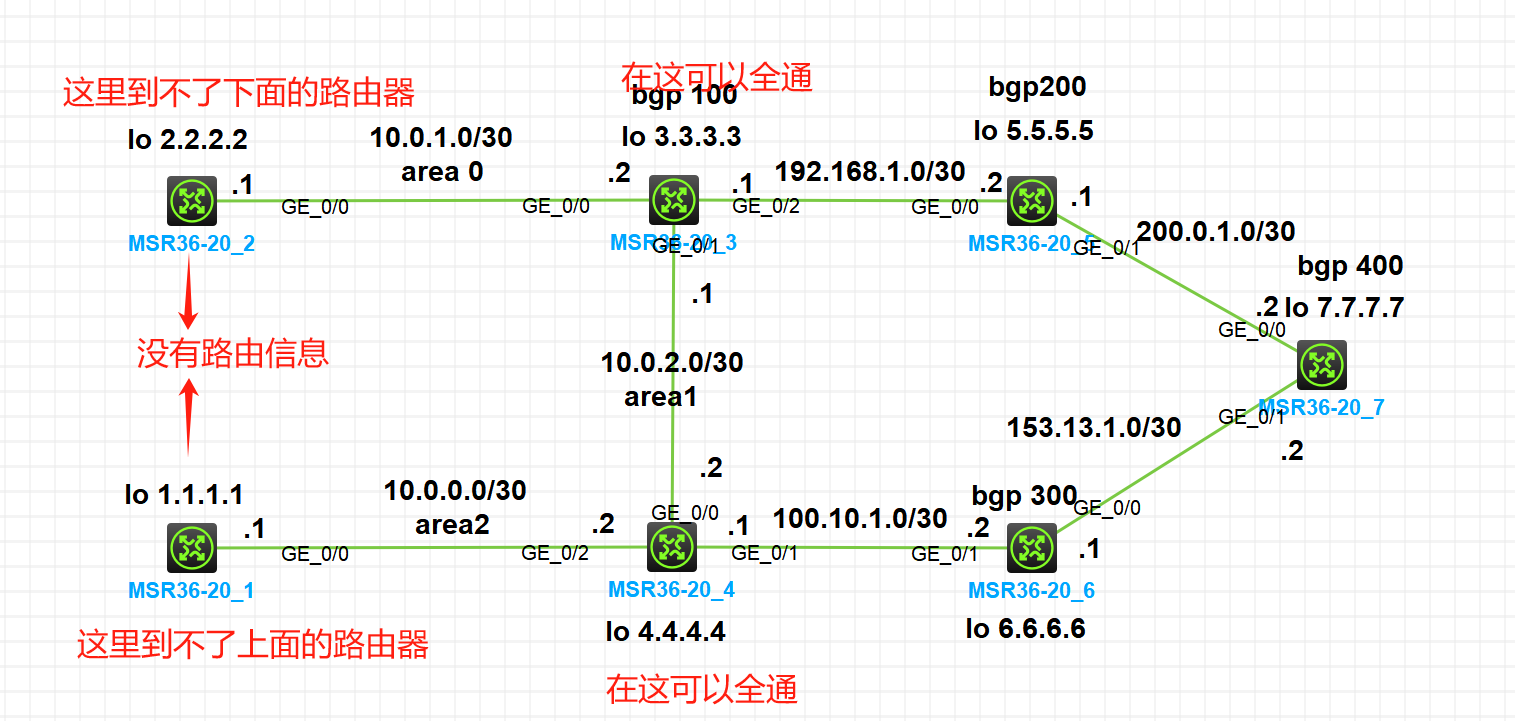 2、R3和R4分别做bgp和ospf重复分布实现权威互联