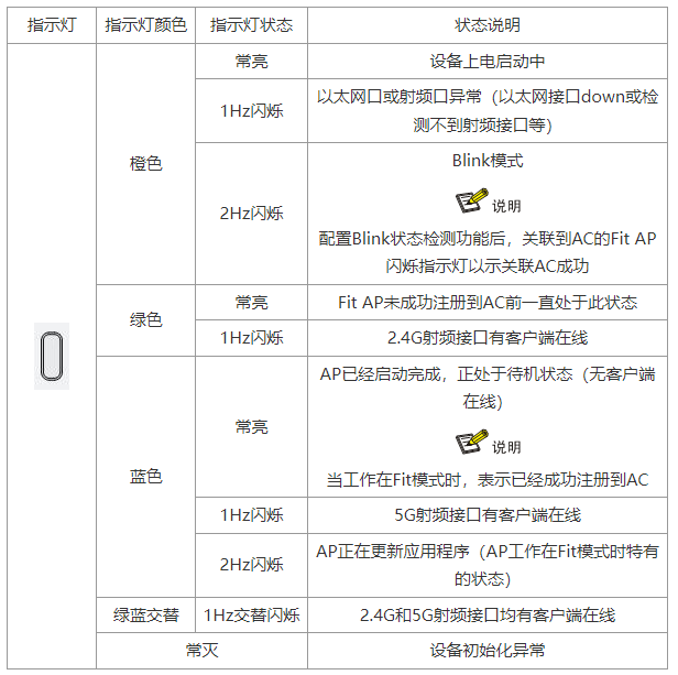 绿色 | 常亮 | AP已经启动完成并已经注册到AC,正处于待机状态(无客户端在线) |