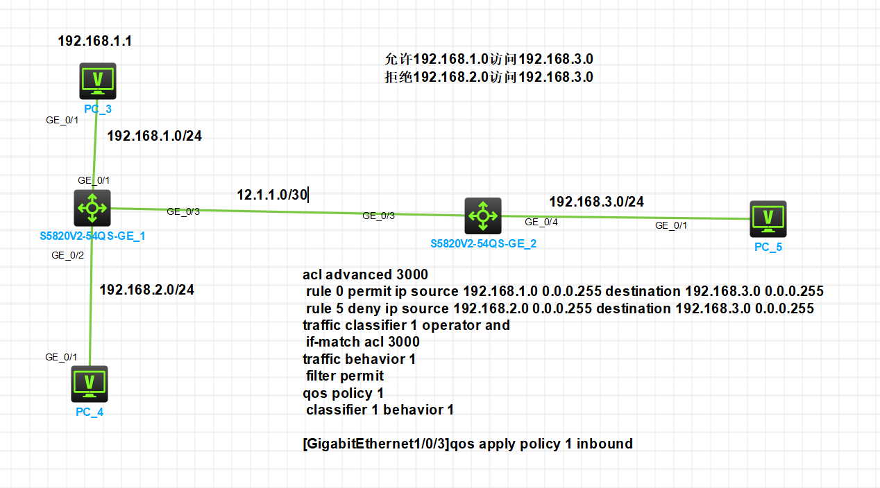 需要再交换机上配置策略,使部分网段可以访问某些网段,再模拟器上做了实现,通过QOS怎么实现不了,配置好ACL和QOS之后,调用之后没起效果.PC4还是可以和PC3通信