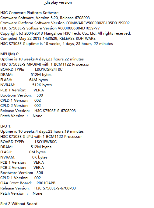H3C S7503E-S uptime is 10 weeks, 4 days, 23 hours, 22 minutes