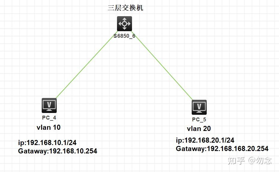 PC4访问PC5,目的IP地址是192.168.20.1和PC4不一个网段的,所以PC4请求网关的MAC地址,封装数据,目的IP地址是20.1,目的MAC地址是网关的mac,二层vlan在交换机添加上vlan10进入交换机内部