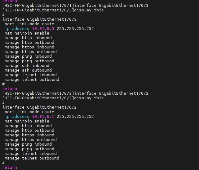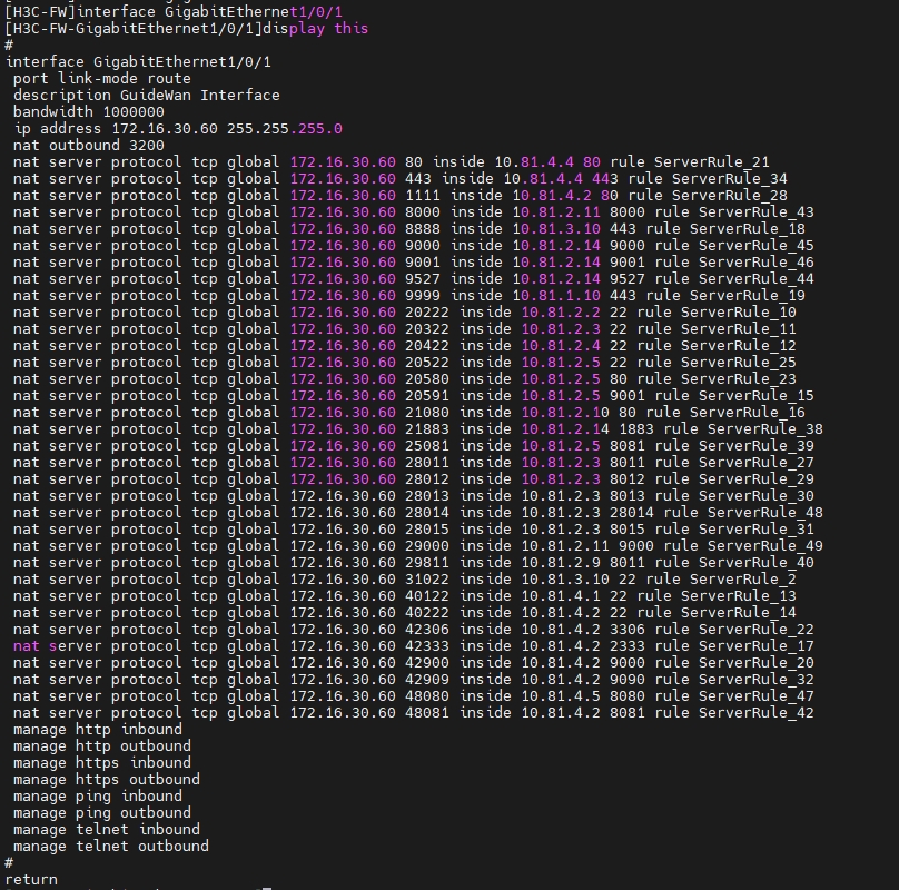 问题:参考防火墙手册中的配置了相关NAT hairpin、ACL、策略等,但内网设备目前只能通过外网ip+端口访问防火墙自身的22、web管理端口,无法访问nat映射的端口。