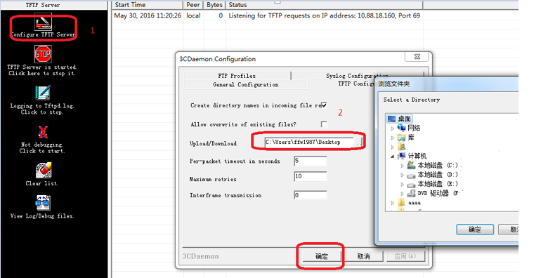 电脑通过网线连接到wx内网,电脑网卡设置为:192.168.0.1 255.255.255.0,设置和wx一个网段,保证电脑和wx网络可达,如下例子打开TFTP服务器, TFTP服务器目录指向电脑桌面,然后点击确定。