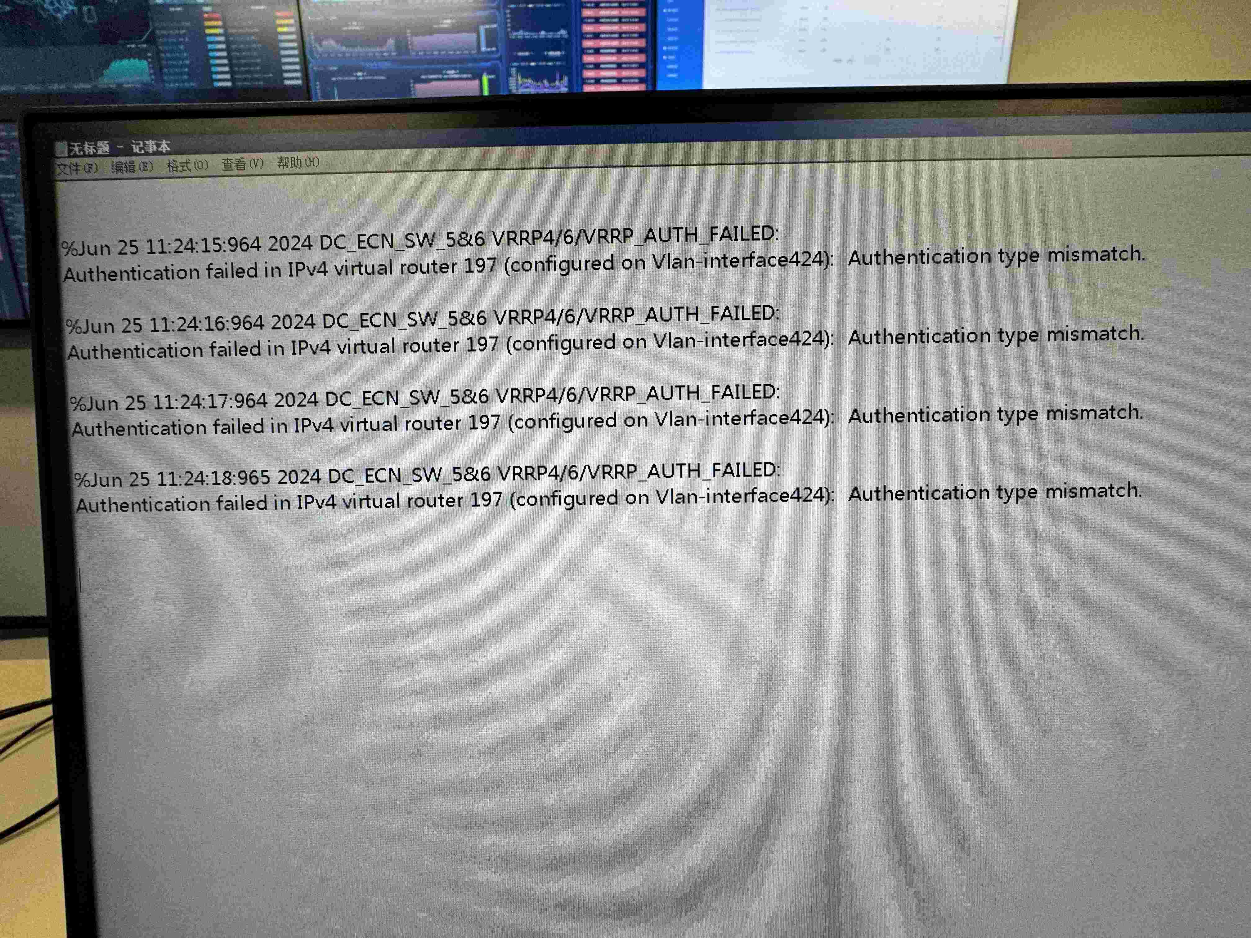 首先确认设备现在还在报错吗。然后display vrrp interface Vlan-interface 424 vrid 197 verbose确认一下Auth Type是不是都是None。最后抓包看看这个网段还有没有其它vrrp成员。如果这样还不能确认问题,建议升级软件版本再观察或咨询400。