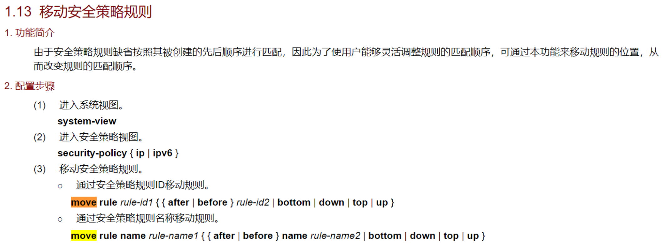 move rule rule-id1 { { after | before } rule-id2 | bottom | down | top | up }