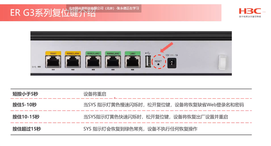 按住设备前面板上的RESET按钮10~15秒,当SYS指示灯黄色快速闪烁时,松开复位键,设备将立刻恢复出厂配置并重新启动。