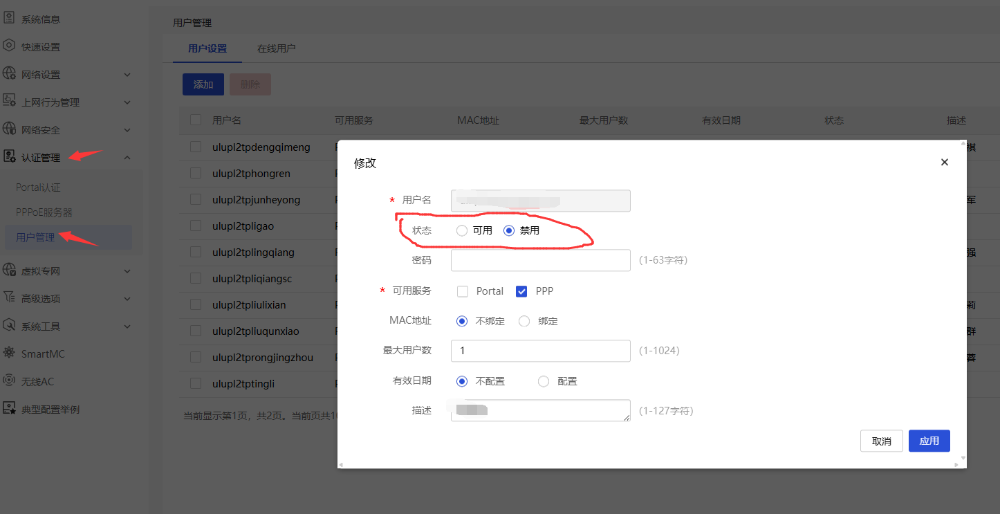 F1070配置了L2TP的LNS业务,禁止某个账号拨入;下线已拨入的用户