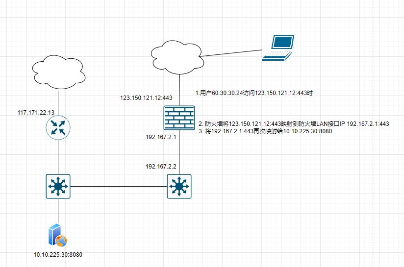 需求:在B园区的防火墙中设置2次NAT,用户从公网访问123.150.121.12:443时,防火墙将123.150.121.12:443映射给LAN接口192.167.2.1:443,然后再次将192.167.2.1:443映射给10.10.225.30:80880