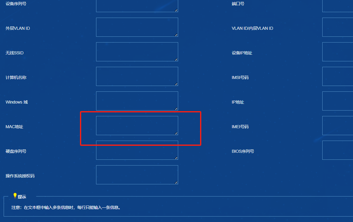 设置用户需要绑定的MAC地址。格式为:XX:XX:XX:XX:XX:XX 、 XX-XX-XX-XX-XX-XX 或 XXXX-XXXX-XXXX,其中X只能是如下合法字符:[A,F]∪[a,f]∪[0,9]。