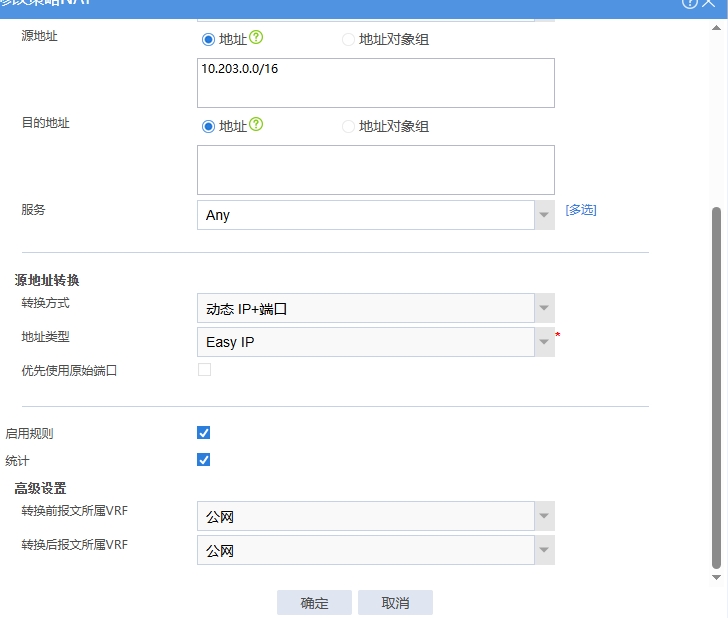 如下图,选择easy-ip方式后,在哪里配置转换后的源IP?这条策略配置完转换后的源IP是空的