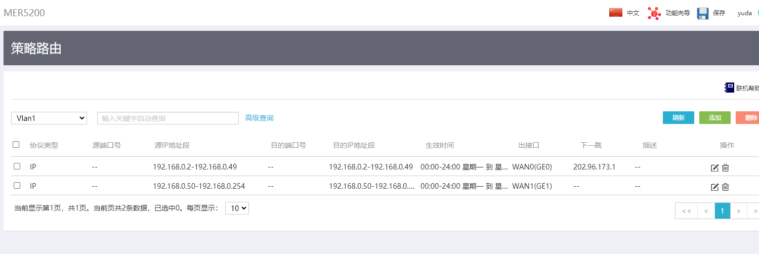公司是双网接入,原来一条是WAN0口是一条100M固定IP宽带,设置路由器2到49的IP段走WAN0口出站,WAN1口接的是一条1000M的普通宽带,设置路由器49到254IP段走WAN1口出站,这个设置路由器生效能用,但是最近把1000M的普通宽带改成了一条200M的固定IP宽带,并接在WAN0口上,把原来在WAN0口上的100M固定IP宽换成WAN1口上,然后这个策略路由重新设置之后就不生效了,不管电脑上的IP地址是设置在2到49网段还是设置在49到254网段都的都是WAN0口出站,但是在路由器管理界面的系统信息里面看两条宽带都是连接正常,并且WAN1口还有数据流,请问这个问题要怎么解决。