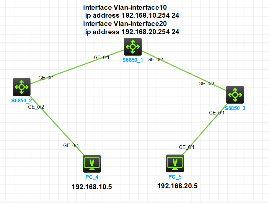 S6850_1为核心,下面两台交换机当傻瓜交换机使用,不进行配置,只配置核心的情况下如何让下面的两台终端能够互访,各位大佬帮我看看配置,哪里出了问题?
