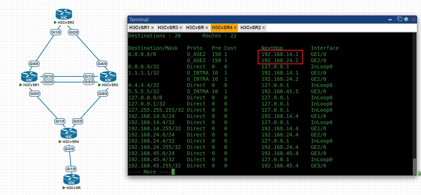 可能我没说清楚,R1和R1是堆叠关系,向上只有一条默认路由,通告给R4后,在R4看来是有两条默认路由的,下一跳为分别堆叠组的两个地址,我想让R4只加表一条默认路由