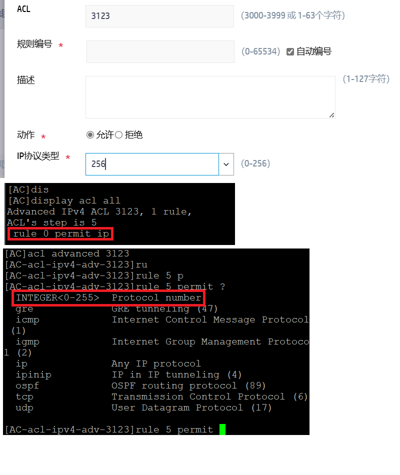 我试了一下,web版的256就是匹配所有ip协议,也就是命令行版的permit/deny ip。