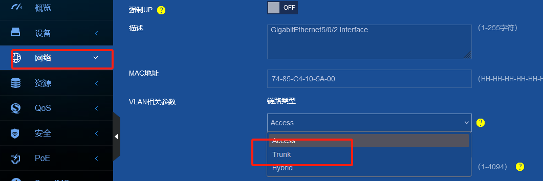 登录进去点【网络】选择接口,右侧有个箭头点进去,点进去之后,修改链路类型