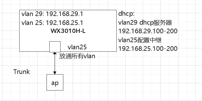wx中 一个口设置trunk pvid 为25,放通vlan25 vlan29, ap连接此口
