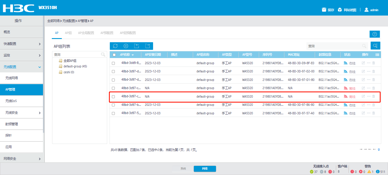 wx3510添加ap显示离线,ap型号是WA5320.在核心交换机上能查到这个ap的mac。网线也拔插过,ap现在闪绿灯。