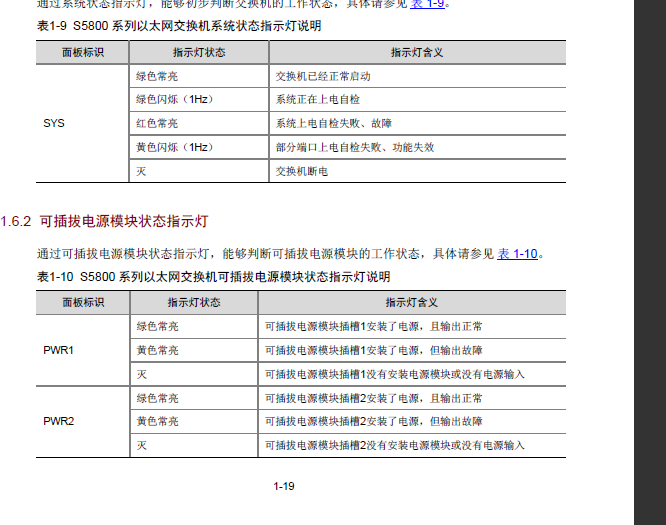 表1-9 S5800系列以太网交换机系统状态指示灯说明