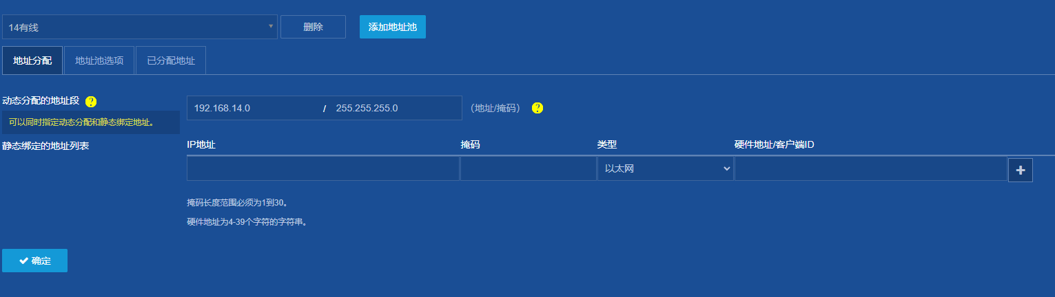 VLAN的DHCP为192.168.14.0/24,想要IP地址是100-240,保留2-99作为固定IP使用(方便在客户端固定)