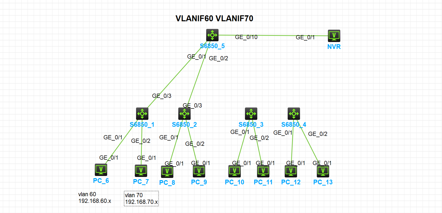 PC6、PC7分别代表: vlan60的摄像头、vlan70的摄像头。地址分别为:192.168.60.1、192.168.70.1,接入层也做了相应的access和trunk,以及相应的配置。摄像头是能ping通NVR的。