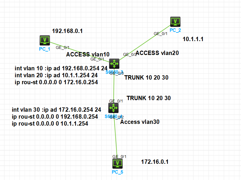 想问一下为什么我这么做配置上面两个PC可以做到不同网段互通,但是下面这个PC跟上面不能互通,跳静态了还不行,但是跑OSPF都发布就行了,配置和拓扑如图