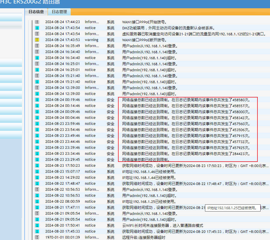 如图所示:网络连接数达到总量限制?棒棒看看系统日志,有什么问题吗?