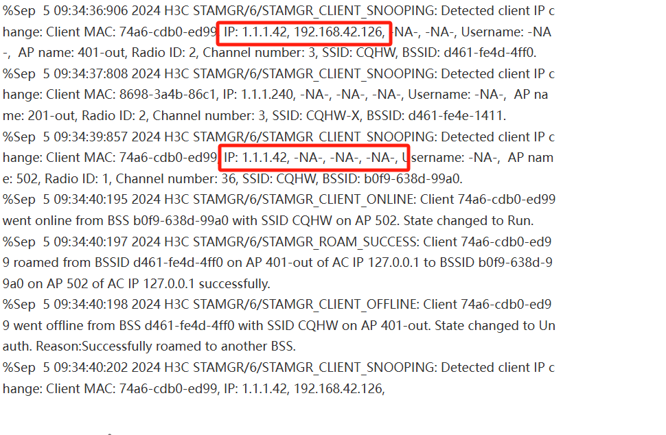 %Sep 5 09:34:36:906 2024 H3C STAMGR/6/STAMGR_CLIENT_SNOOPING: Detected client IP change: Client MAC: 74a6-cdb0-ed99, IP: 1.1.1.42, 192.168.42.126, -NA-, -NA-, Username: -NA-, AP name: 401-out, Radio ID: 2, Channel number: 3, SSID: CQHW, BSSID: d461-fe4d-4ff0.