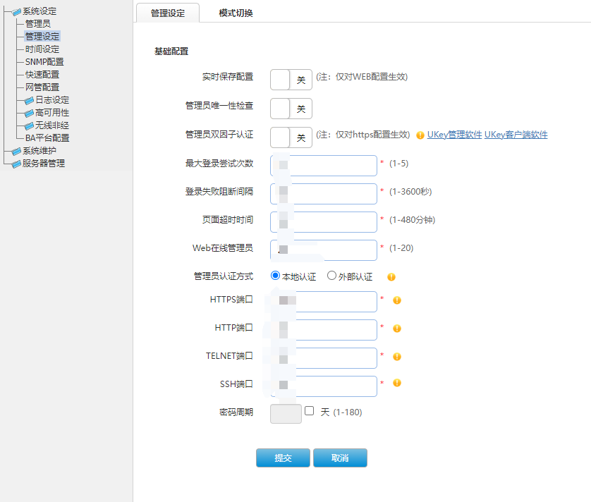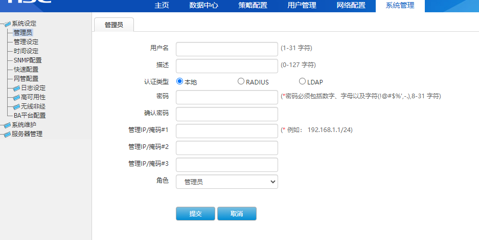 认证类型 | 有三种认证类型: · 本地认证; · RADIUS认证; · LDAP认证。 |