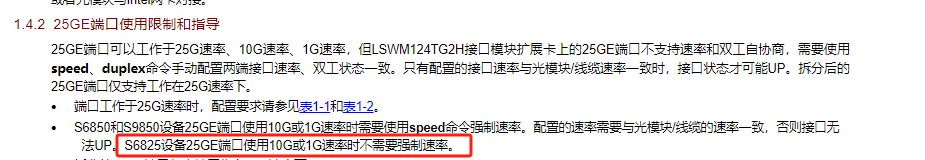 S6850和S9850设备25GE端口使用10G或1G速率时需要使用speed命令强制速率。配置的速率需要与光模块/线缆的速率一致,否则接口无法UP。S6825设备25GE端口使用10G或1G速率时不需要强制速率。