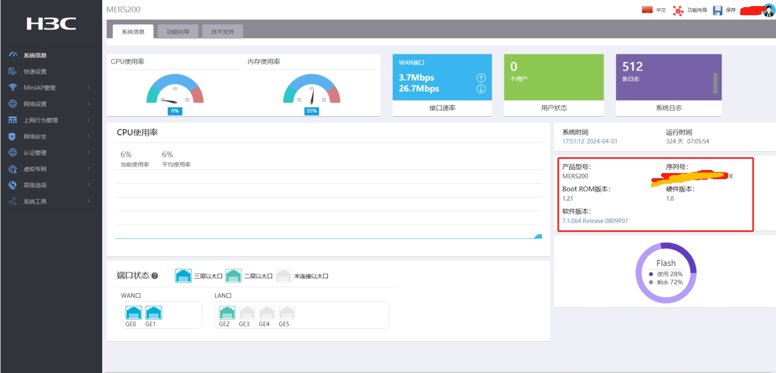 用户名密码登录界面还显示MER5200,目前除产品型号和序列号变化外,基本配置没变,上网正常。