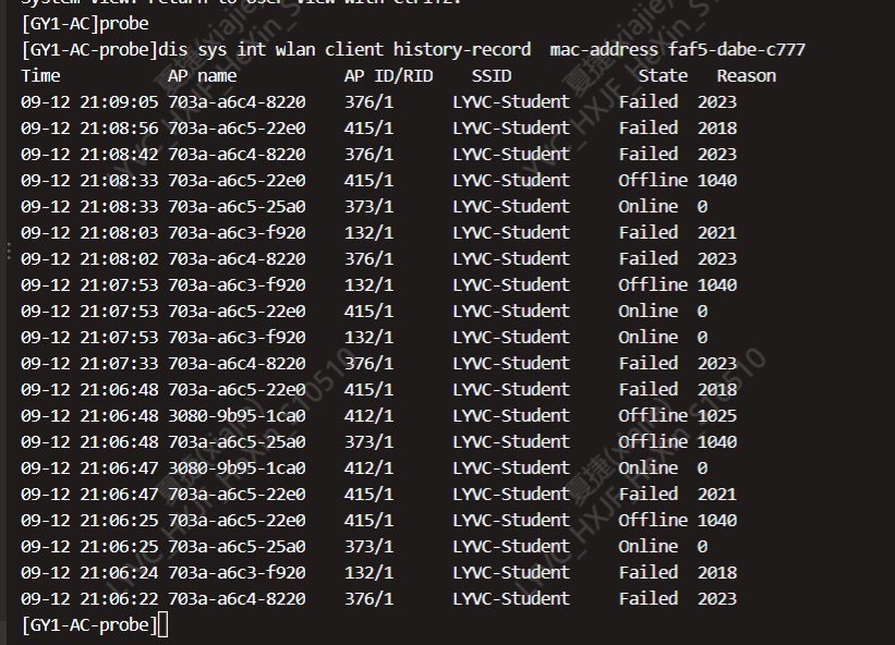 可以根据display system internal wlan client history-record help reason-code命令看一下离线编码对应的原因,另外可以参考该链接对无线优化:https://www.h3c.com/cn/d_202304/1831608_30005_0.htm