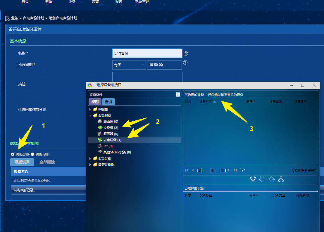提示“已自动过滤不支持的设备”,导致1台防火墙、2台交换机,无法选中