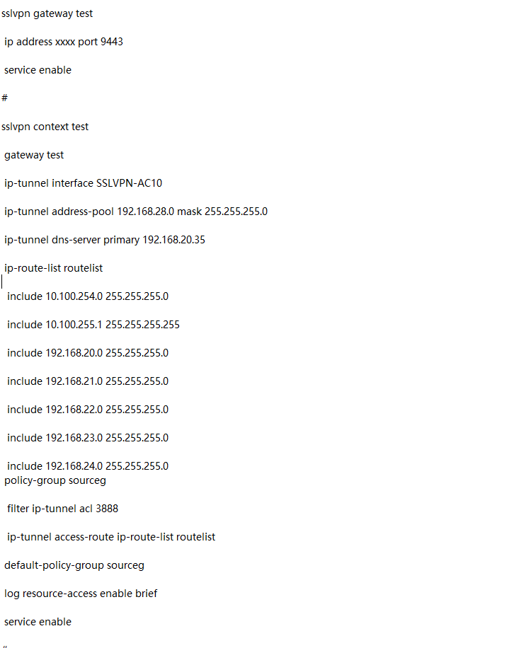 华三防火墙SSLVPN问题,连接上SSLVPN,无法访问内网部分资源,SSLVPN能访问服务器网段的网关,服务器都是在同一网段,但是有一部分服务器访问不了,也无法ping通,下面是SSLVPN配置,其中ACL配置:acl advanced 3888     rule 10 permit ip