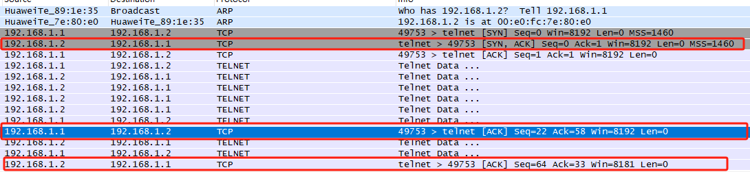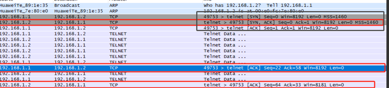 这些步骤和示例数据包展示了Telnet TCP连接的建立过程。