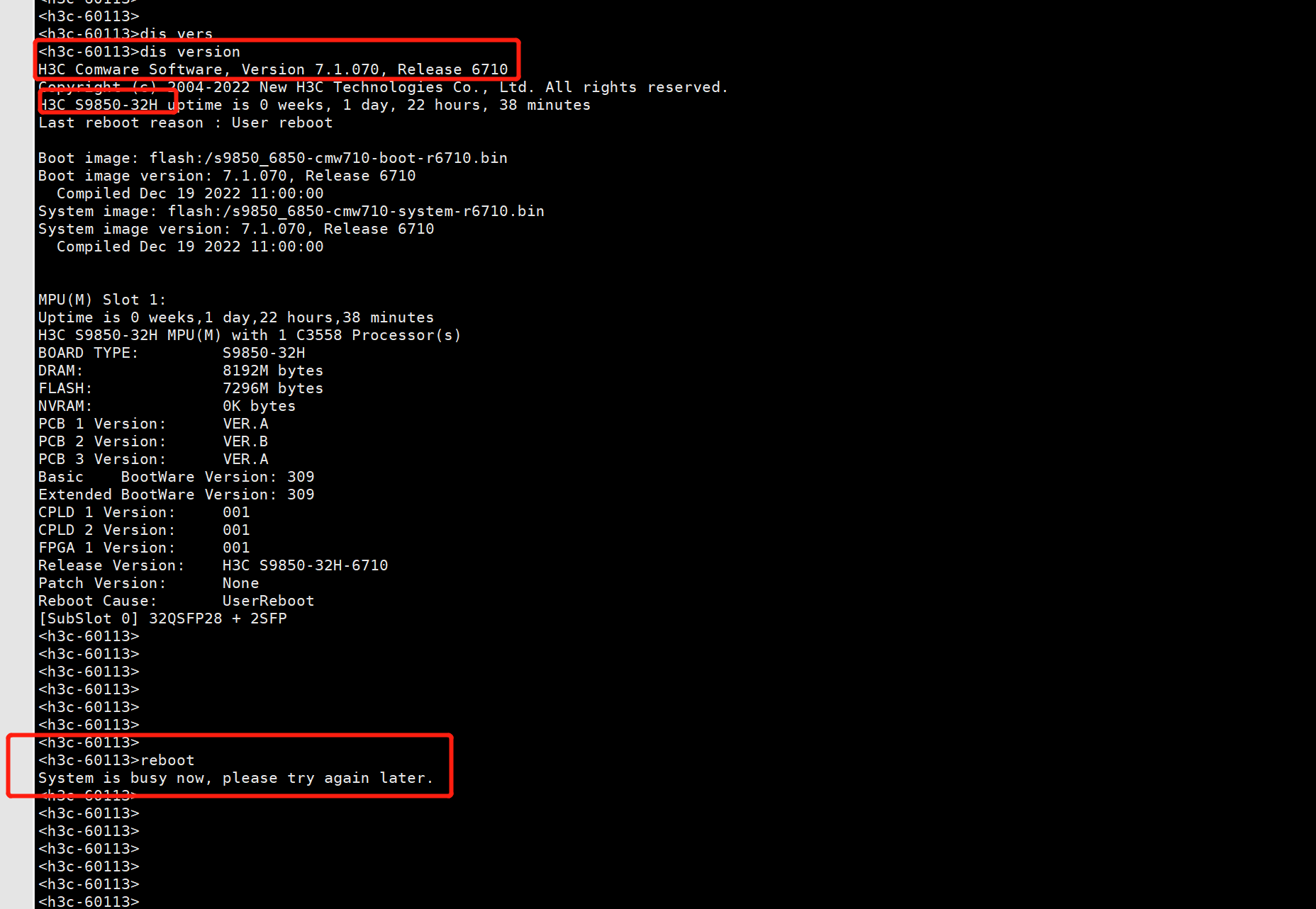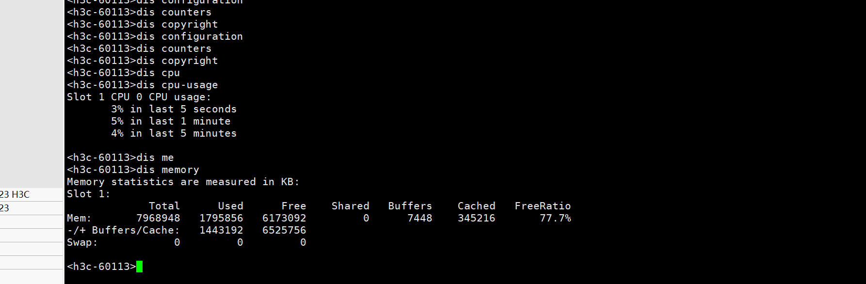 <h3c-60113>dis cpu-usage Slot 1 CPU 0 CPU usage: 3% in last 5 seconds 5% in last 1 minute 4% in last 5 minutes <h3c-60113>dis me <h3c-60113>dis memory Memory statistics are measured in KB: Slot 1: Total Used Free Shared Buffers Cached FreeRatio Mem: 7968948 1795856 6173092 0 7448 345216 77.7% -/+ Buffers/Cache: 1443192 6525756 Swap: 0 0 0 <h3c-60113> 正常的