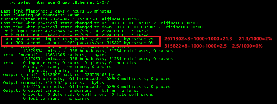 7接口是一个千兆口,最大带宽是1000Mbps,所以带宽利用率就是21.3/1000≈2%