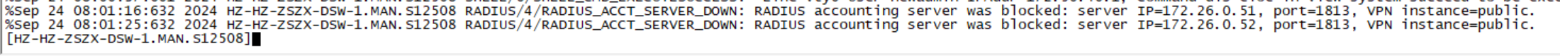 %Sep 24 08:01:25:632 2024 HZ-HZ-ZSZX-DSW-1.MAN.S12508 RADIUS/4/RADIUS_ACCT_SERVER_DOWN: RADIUS accounting server was blocked: server IP=172.26.0.52, port=1813, VPN instance=public.