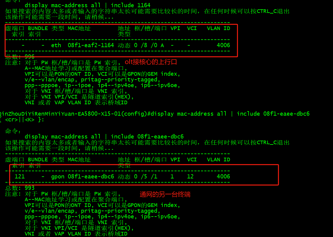 这边H3c s7506e接的华为的OLT,下面的某一台onu一根线外接了一台接入层交换机,交换机上有几台终端,其中有一台终端不通内网,网关都不通(网关都设置在核心交换机)但是和交换机上的其他终端是互通的,通过OLT发现,这两台终端都学到了mac地址,且Mac已经从OLT的上行出去,但是核心有通的终端的IP和mac都有了,而另一台却收不到mac地址。
