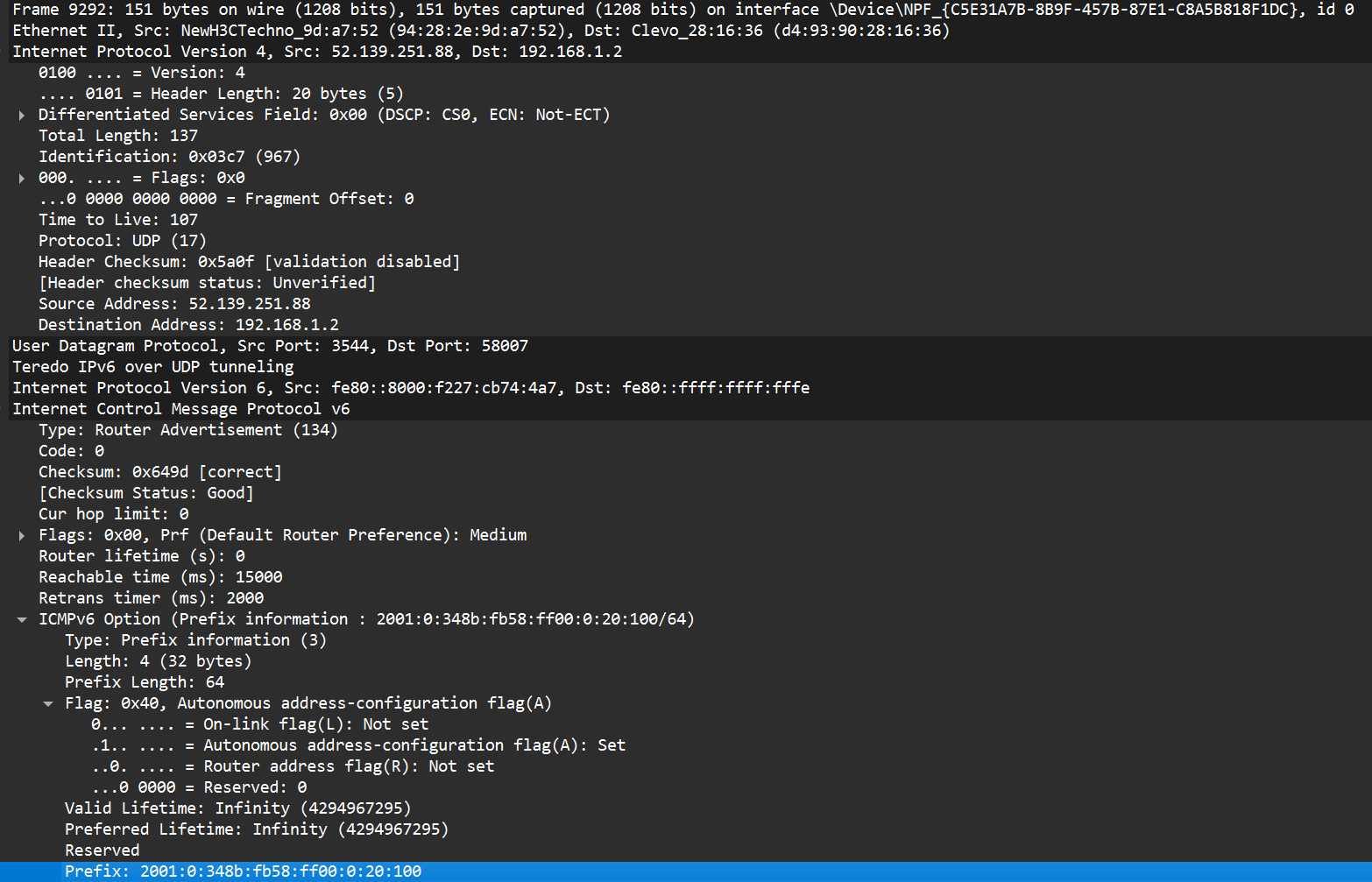 这是我抓到的RA报文,我想配置IPV6 SLAAC无状态获取地址,但是我使用了ipv6 nd ra prefix x:x:x::/64设置了前缀他依然不能按照我设置的前缀进行通告,而且是teredo通过ipv4进行传输的RA报文,并且来源IP是未见过的公网IP并且通告前缀是从未见过的前缀,请问这要怎么配置?我只配置了VLAN接口下的一条ipv6 nd ra prefix 2001:da4:564:951::/64和ipv6 address auto link-local命令