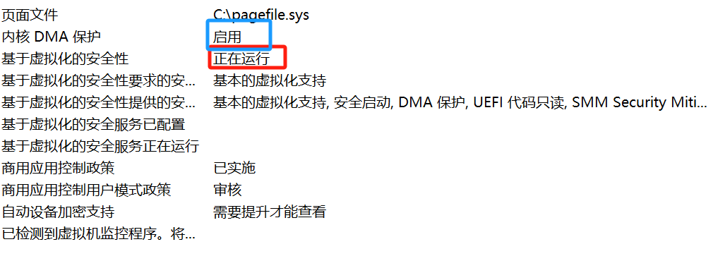 弄到最后,基于虚拟化的安全性显示 关闭,但是仍然无法在模拟器中启动设备。不知道是不是内核DMA保护没关掉 导致的。