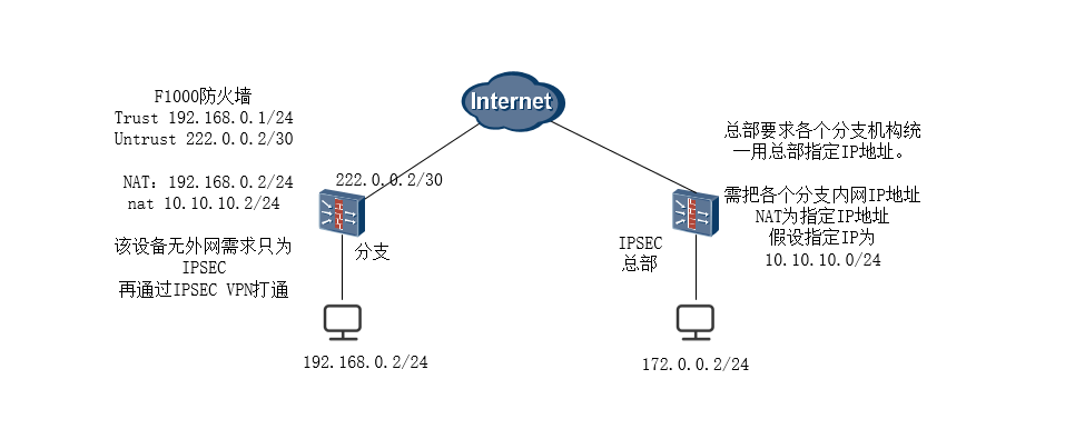 请问假如在接口上同时配置了ipsec vpn和nat,我需要先把192网段地址nat成 10网段地址,再通过IPsec vpn 与总部互通。