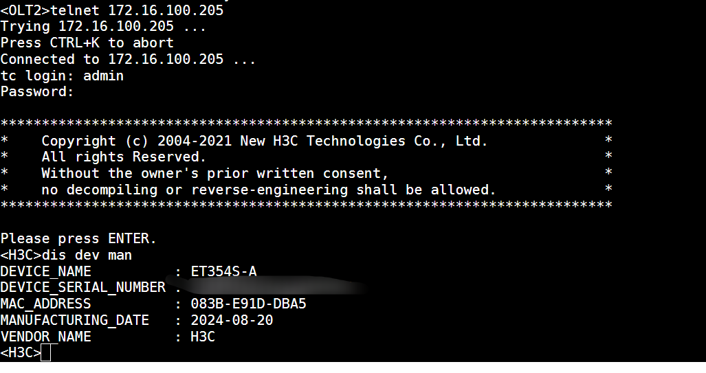 ONU上线后,可通过地址telnet登陆上去查看序列号
